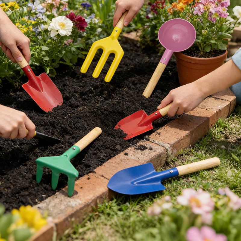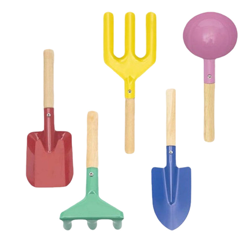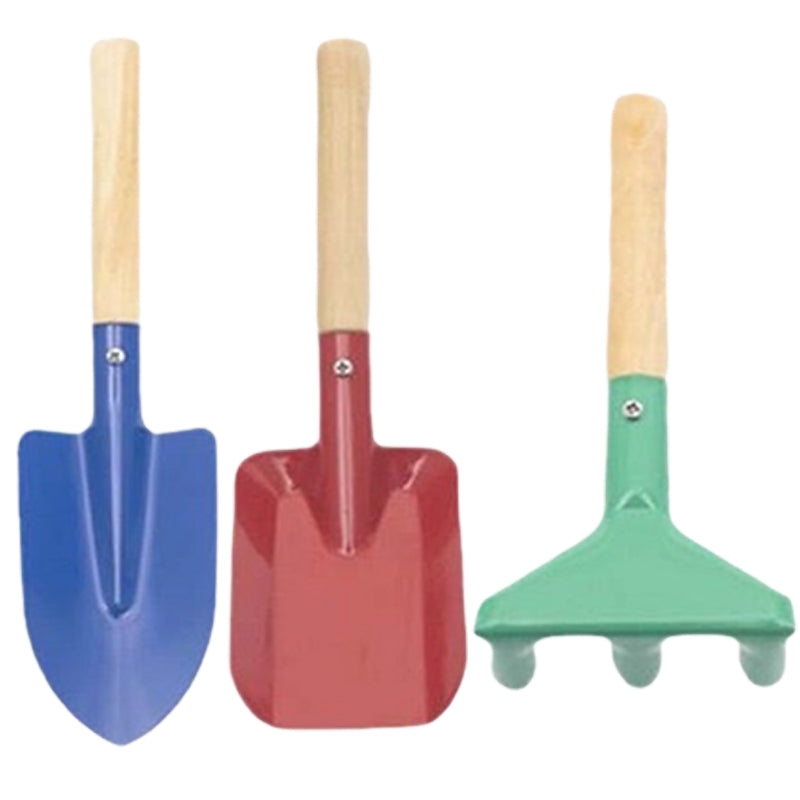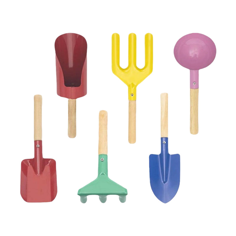 Kolor: niebieska łopatka z ostrym końcem, czerwona łopatka kwadratowa, zielone grabie, zestaw 3-częściowy, uchwyt do łopatki ręcznej, widelec 3-zębowy, różowa łopatka, zestaw 5-częściowy, zestaw 6-częściowy.
