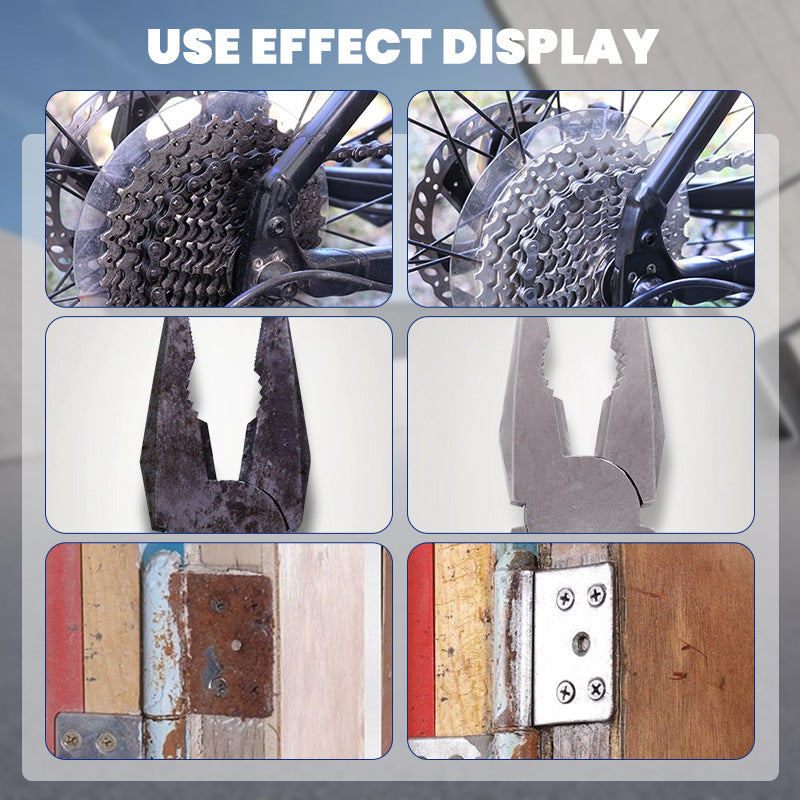 Po nałożeniu sprayu do usuwania rdzy odczekaj 2-3 minuty. Następnie delikatnie przetrzyj powierzchnię papierem ściernym, aby usunąć rdzę. Produkt nie jest korozyjny i nie uszkadza obrabianego przedmiotu.