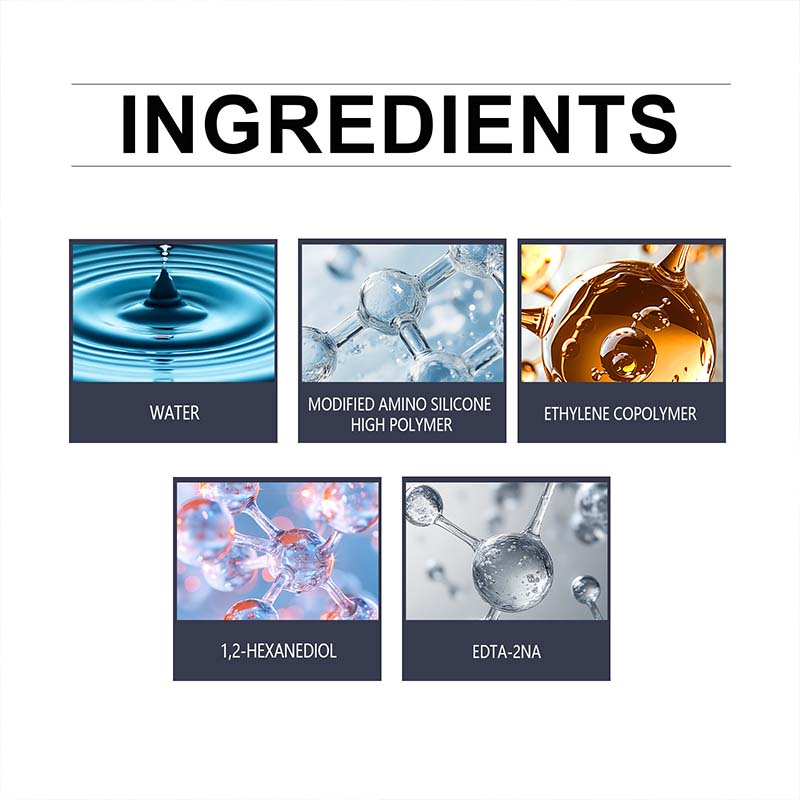 Skład: woda, modyfikowany polimer aminokwasowo-silikonowy, kopolimer etylenu, 1,2-heksanodiol, EDTA-2Na