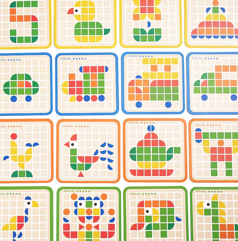 Poprawia zdolności motoryczne i precyzję, ponieważ dzieci manipulują różnymi drewnianymi elementami i umieszczają je dokładnie w wyznaczonych miejscach na wzorzystej planszy puzzli.